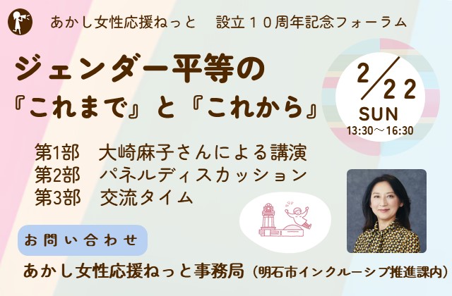 あかし女性応援ねっと設立10周年記念フォーラムを開催します。1部はジェンダー・スペシャリストとして、国連女性の地位委員会の日本代表を務められた大崎麻子さんによる基調講演、2部はパネルディスカッション、3部は交流タイムを予定しています。この10年で、みなさんの周囲の「ジェンダー平等」はどのように変化しましたか?「これまで」を振り返りながら、「これから」のよりよい未来を創るために、この機会に一緒に考えてみましょう!