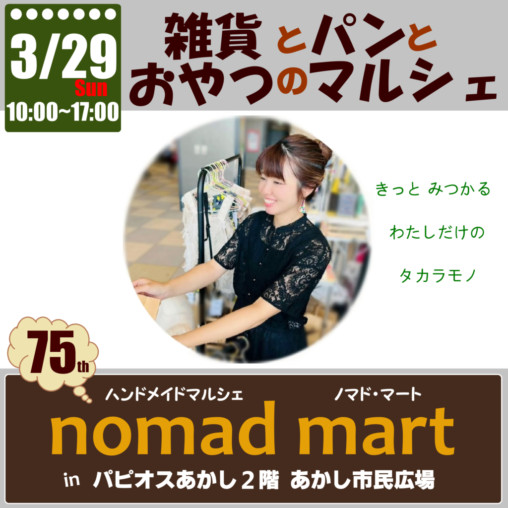 3/29(日)ハンドメイドマルシェ ノマド・マート マーケット ツイート シェア 保存 LINEで送る B! 雑貨とパンとおやつのマルシェ 1つ1つ心を込めて制作された 世界にたった1つだけのオリジナル作品を展示販売するハンドメイドイベントです 各地で活躍する人気作家があかし市民広場に集います さらに素材や製法にこだわり抜いたパンや焼き菓子などのおやつも販売いたします (出店者は変更になる場合がございます) 日程 3/29(日) 時間 10:00~17:00 お問い合わせ先 ノマドマ事務局 nomadmart39@gmail.com Web HP Instagram Facebook